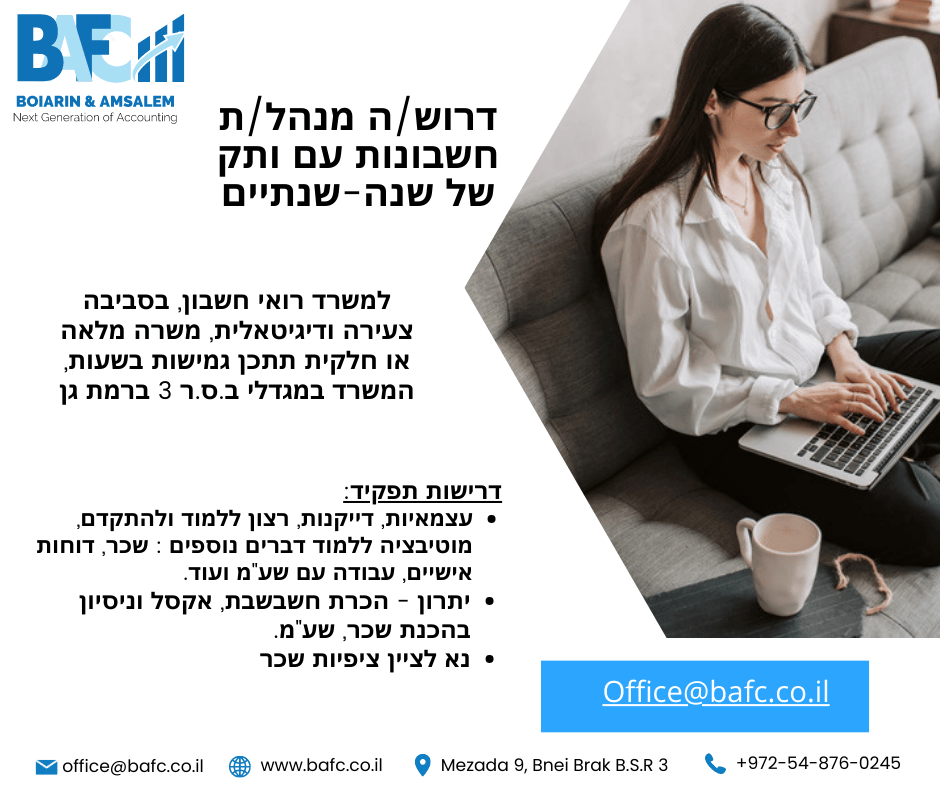 משרת מנהלת חשבונות לחברות (מספר משרה 26A) דרושה מנהלת חשבונות עם ניסיון של שנה-שנתיים לצורך ניהול חברות מגוונות במשרד רואי חשבון.טיפול ומענה לבעלי חברות, פיקוח ובקרה על עובדים זוטרים במשרד, דיווחים לרשויות המס.יכולת עבודה בסביבה ממוחשבת ודיגיטלית מאוד עם מגוון מערכות מידע חדישות.מענה מקצועי נרחב ללקוחות המשרד בתחומים של ביטוח לאומי, מס הכנסה, מקדמות, מע"מ וכו'.ידע בתוכנות חשבשבת, ריווחת, פינבוט, חיסולית יתרון.רצון ללמוד ולהשקיע, משרה עם אופק ניהולי והתפתחותי במשרדינו.משרדינו ממוקם ברמת גן גבול בני ברק, הסביבה היא דיגיטלית מאוד, אווירה משפחתית ונעימה, התפקיד ישירות מול השותפים המשרד.יתכן וניתן יהיה לשלב עבודה היברידית (חלק מהשבוע עבודה מהבית)לשלוח קורות חיים לאימייל office@bafc.co.il עם ציון ציפיות שכר.